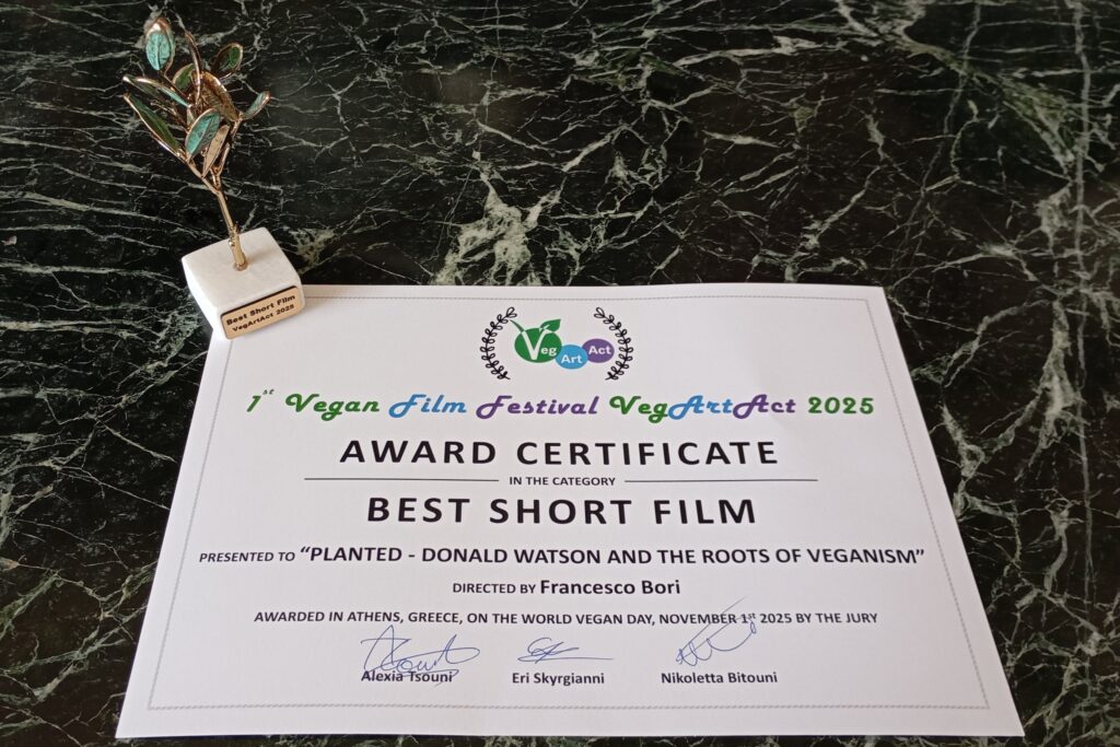 And the BEST SHORT FILM AWARD of the 1st Vegan Film Festival VegArtAct 2025 goes to “PLANTED – DONALD WATSON AND THE ROOTS OF VEGANISM”, directed by Francesco Bori (Canada, UK), awarded by Kostas Gonianakis, Member of the Board of Directors of Vegan Life NGO!