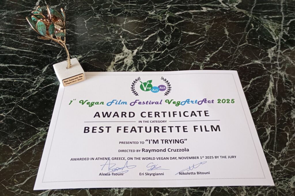 And the BEST FEATURETTE FILM AWARD of the 1st Vegan Film Festival VegArtAct 2025 goes to “I’M TRYING”, directed by Raymond Cruzzola (Canada), awarded by Alexandra Stergiou, actress & vegan activist!