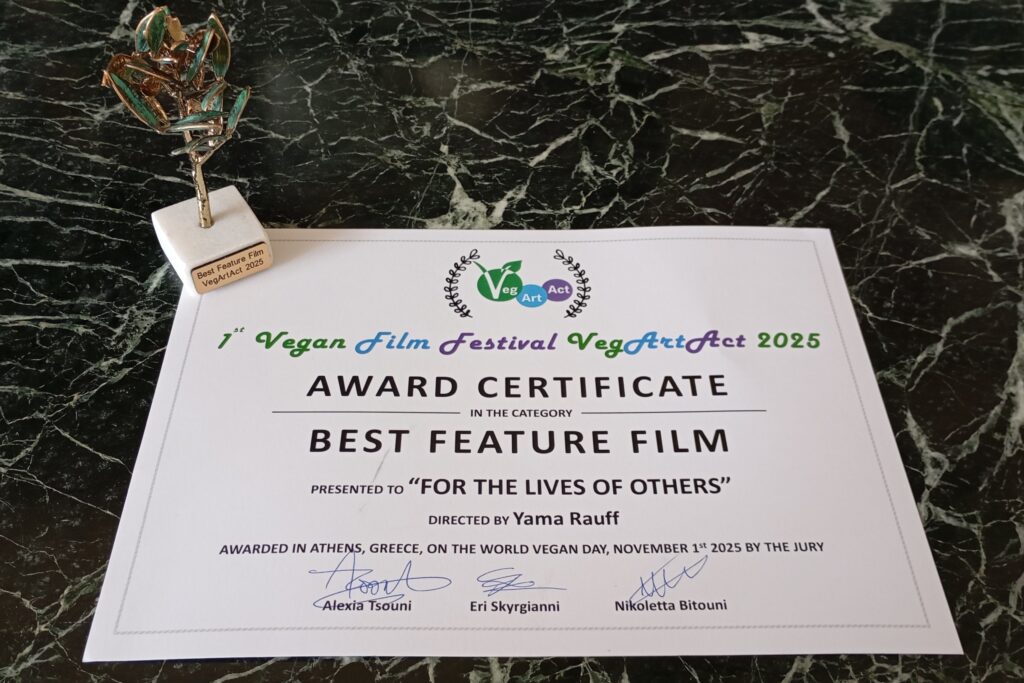 And the BEST FEATURE FILM AWARD of the 1st Vegan Film Festival VegArtAct 2025 goes to “FOR THE LIVES OF OTHERS”, directed by Yama Rauff (Afghanistan, Denmark, Iceland), awarded by Alexia Tsouni, Jury member, President of the FemArtAct social cooperative!