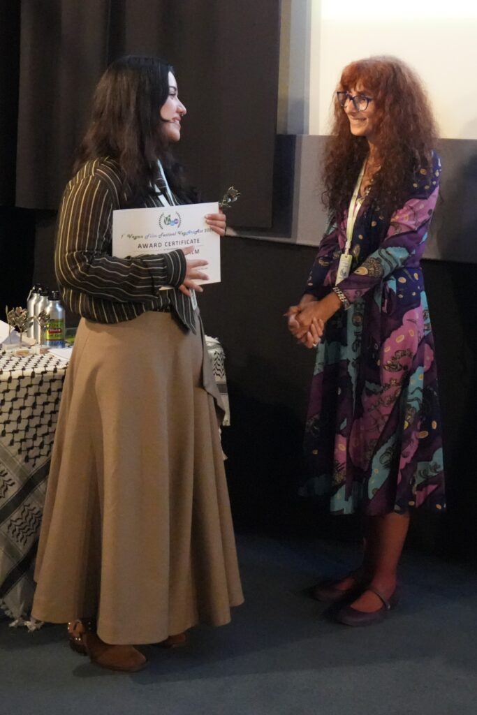 And the BEST GREEK FILM AWARD of the 1st Vegan Film Festival VegArtAct 2025 goes to “BLOODY THURSDAY”, directed by Evangelos Vlachakis (Greece), awarded by Nikoletta Bitouni, Jury member, Founder of the Vegan Farm in Athens!