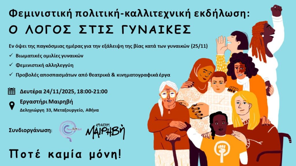 Εν όψει της παγκόσμιας ημέρας για την εξάλειψη της βίας κατά των γυναικών (25/11), η FemArtAct και το Εργαστήρι Μαιρηβή συνδιοργανώνουν εκδήλωση με βιωματικές ομιλίες γυναικών, φεμινιστική αλληλεγγύη και προβολές αποσπασμάτων από θεατρικά και κινηματογραφικά έργα. Ημερομηνία: Δευτέρα 24/11/2025, 18:00-21:00Τοποθεσία: Εργαστήρι Μαιρηβή, Δεληγιώργη 33, Μεταξουργείο, Αθήνα Καλωσόρισμα: Μαιρηβή Βερυκόκκου – Γεωργιάδου, Εργαστήρι ΜαιρηβήΣυντονισμός: Αλεξία Τσούνη,…